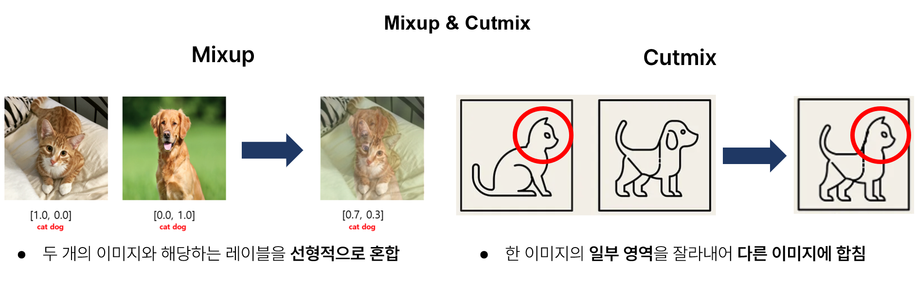 여러 논문을 바탕으로 Mixup보단 Cutmix가 다양한 Task에서 더 좋은 성능을 보임을 확인하였으며 이를 기반으로 파라미터를 조정하여 실험해 보았습니다.