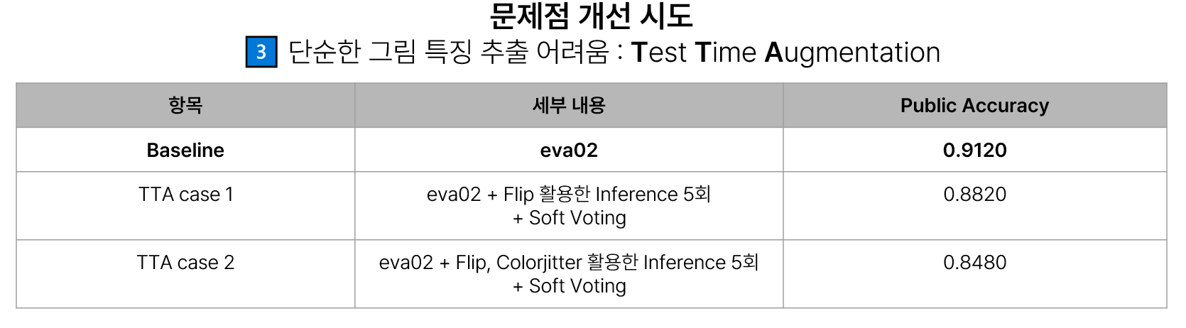 모델의 오류를 해결할 수 있는 TTA를 진행해보기도 하였으나, 실험결과 오히려 성능이 낮아지는 모습이 보여 이또한 보류하였습니다.