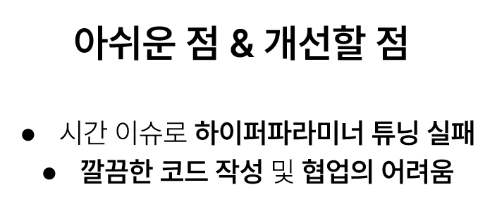 프로젝트를 진행하며 아쉬웠던 점은 방금 언급했던것과 동일하게 시간이 부족해서 옵티마이저, lr ,bastch size, 스케쥴로와 같은 하이퍼파라미터 튜닝을 하지 못했고, 그래서 성능을 최대한으로 끌어올리지 못했던 점, 또한 협업 과정에서 깔끔하게 코드를 작성하지 못했고 코드를 서로 설명해주는 과정에서 협업이 부드럽지 못하는 아쉬움이 있었습니다.