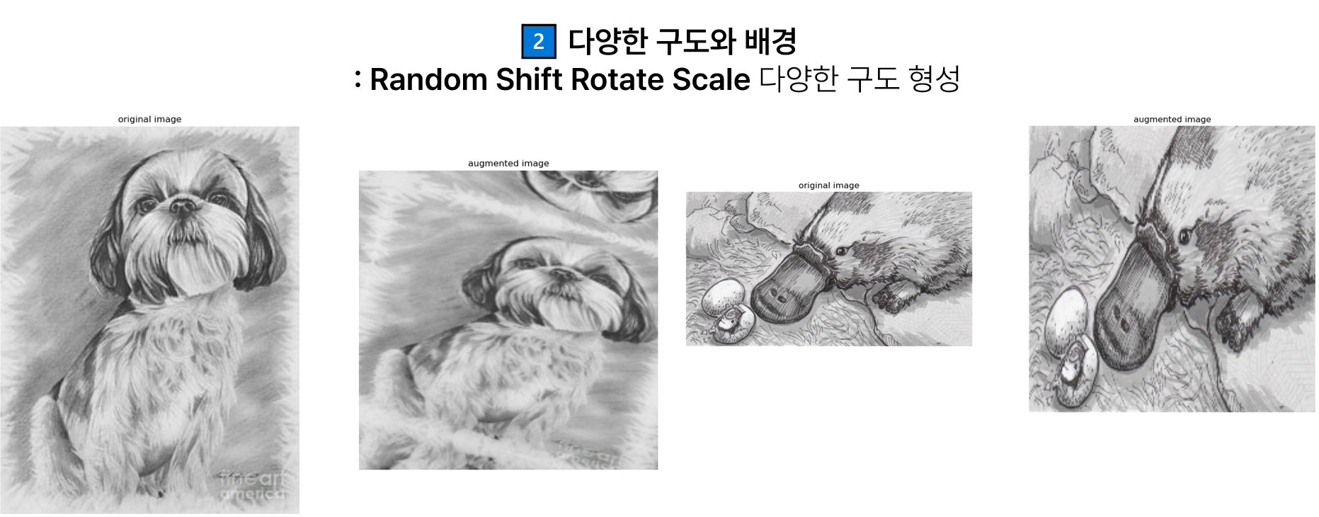 따라서 실제 우리가 생각하는 것보다 unique한 train data는 적을 수 있을것이라 판단하였고 이와 유사한 특징이 test sketch image에서도 나타난다고 가정했을 때 이러한 특징을 반영하는 augmentation이 도움이 될 수 있다고 생각하였습니다.