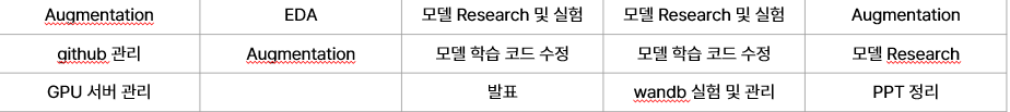 프로젝트를 시작하기에 앞서, 각자의 역할을 나누고 주어진 일을 진행하기로 결정하였습니다. 크게 나눈 부분은 Augmentation, github 관리, GPU서버 관리, EDA, 모델 Research 및 실험, 모델 학습코드 수정, wandb 실험 및 관리, 발표, 레포트 작성입니다. 전 이중에 모델 Resarch 및 실험과 전반적인 모델 실험부분, 발표를 담당하였습니다.