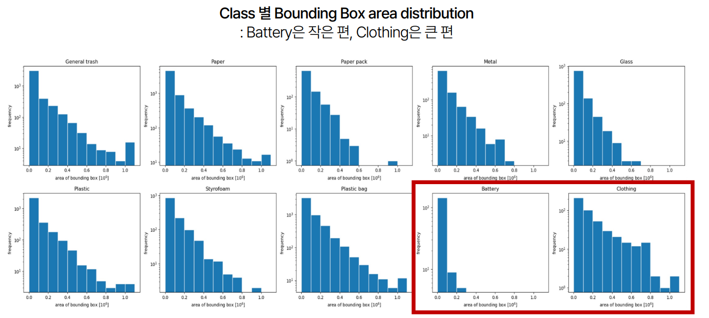 - Bounding Box 분포: 대부분의 Bounding Box는 이미지의 중앙에 위치해 있었으며, 배터리와 같은 작은 물체는 작은 Bounding Box를, 옷과 같은 큰 물체는 큰 Bounding Box를 가지고 있었습니다.