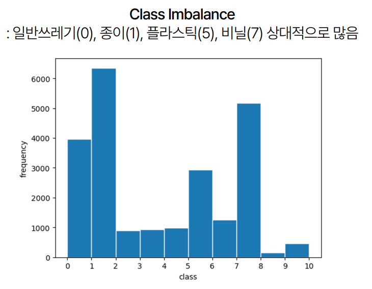 프로젝트 초기에는 데이터셋을 분석하고, 이를 바탕으로 모델을 설계하기 위한 기초 작업을 진행했습니다. 데이터셋은 한 이미지 안에 여러 개의 Bounding Box가 존재하며, 특히 10개 이상의 Bounding Box가 있는 이미지도 다수 존재했습니다. 또한, 클래스 불균형 문제가 있었는데, 일반 쓰레기(0), 종이(1), 플라스틱(5), 비닐(7) 등의 클래스가 상대적으로 많았습니다.