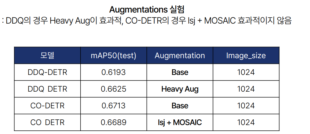 CO-DETR, DINO, DDQ, Cascade R-CNN 모델을 Ensemble한 결과가 가장 높은 성능을 보였습니다.