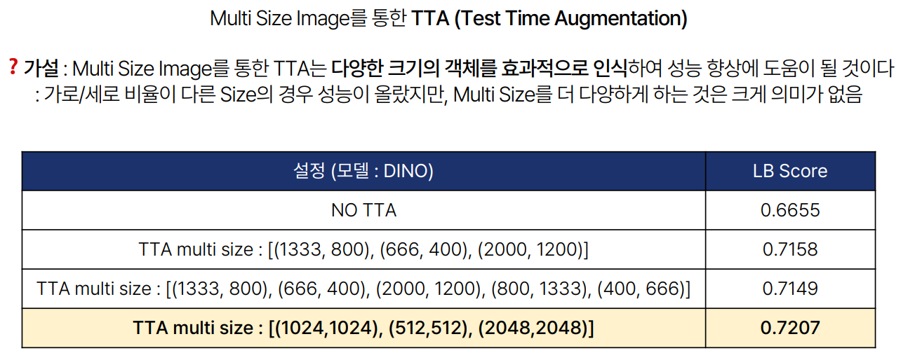 - TTA(Test Time Augmentation): Test 데이터셋에 Augmentation을 적용하여 다양한 크기의 객체를 효과적으로 인식할 수 있도록 했습니다. 특히, Multi Size Image를 활용한 TTA가 성능 향상에 도움이 되었습니다.